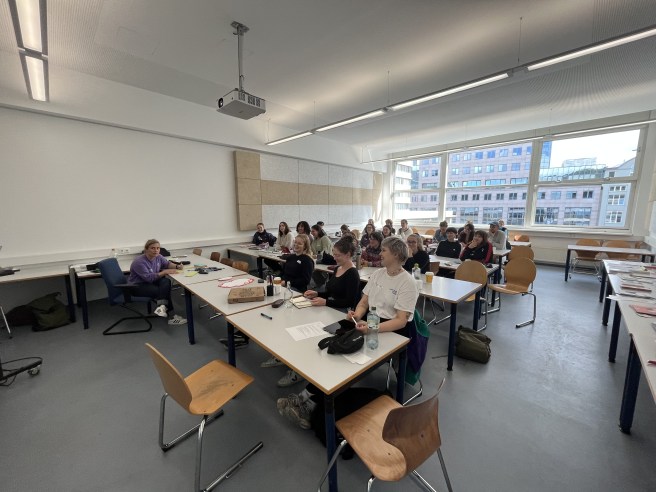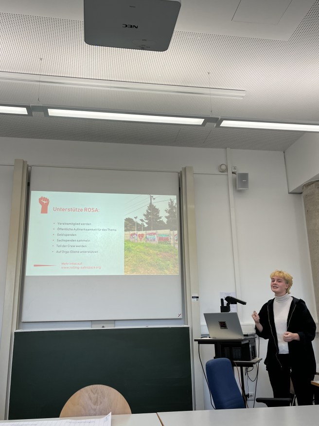 Danach ging es in Kleingruppenarbeit unter anderem zu den Themen Lehre und deutschlandweite Vernetzung. Darauf folgte ein weiterer Vortrag von Rolling Safespace e.V. (ROSA. Ein Verein, der in Griechenland Geflüchetetenunterkünfte anfährt um Frauen einen Safe Space zu ermöglichen (https://www.rolling-safespace.org/)