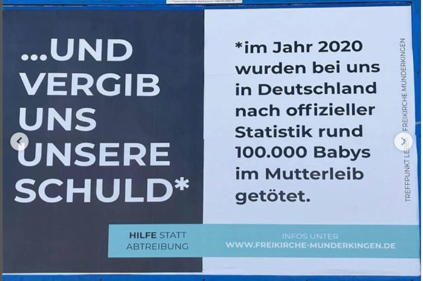 Eine unserer Mitstreiter*innen hat im April 2021 ein Plakat aus der Antichoice Bewegung entdeckt. Darauf ist zu lesen: „…Und vergib uns unsere Schuld*. *im Jahr 2020 wurden bei uns in Deutschland nach offizieller Statistik rund 100.000 Babys im Mutterleib getötet. Hilfe statt Abtreibung“ sowie der Hinweis auf die Homepage der Verantwortlichen.