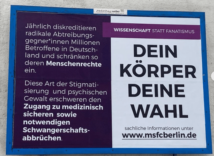 Auf unserem Plakat steht: “ Jährlich diskreditieren radikale Abtreibungsgegner*innen Millionen Betroffene in Deutschland und schränken so deren Menschenrechte ein. Diese Art der Stigmatisierung und psychischen Gewalt erschweren den Zugang zu medizinisch sicheren sowie notwendigen Schwangerschaftsabbrüchen./ Dein Körper deine Wahl/ sachliche Informationen unter http://www.msfc-berlin.de/ Wissenschaft statt Fanatismus“